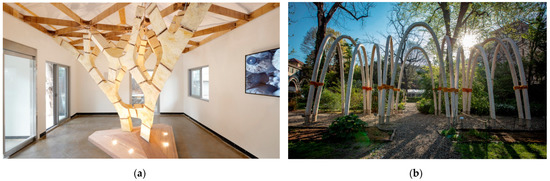 State of the Art: (a) The “MycoTree” at the Seoul Biennale of Architecture and Urbanism, 2017; photo by Carlina Teteris [26]; (b) “The Circular Garden” at the Milan Design Week 2019; photo by Marco Beck Peccoz [27].