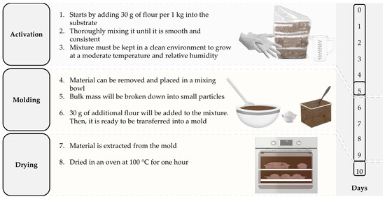 After gaining sufficient knowledge of mycelium’s growing behavior, processes, and favorable conditions, the cultivation process of the organism begins. To obtain a culture, the process of inoculation is required by making first-generation grain spawn and incubating it using a fungal strain. This study focuses on the design of mycelium modules, and, thus, the inoculation process was discarded because of the lack of a contained environment with proper sterility, as well as the imposed long growing period required to achieve a mature culture. One commonly used method for fabricating mycelium modules is to grow them using a mycelium growing kit, which is based on Do-it-Yourself practices and can be customized for personalized product applications (Figure 2). Mycelium growing kits are becoming available on the market, making the material accessible to the public and allowing users to grow their products. Several companies introduced growing kits and made them easily accessible for regular users, such as the mycelium growing kit from the company Grown.bio (Heerewaarden, The Netherlands), which is used in this study to produce all the physical prototypes [23]. The kit contains 3 L of moistened hemp substrate particles of 5–15 mm inoculated with active mycelium. This growing kit grows to fill a volume of 3398 cm3 and achieves a composite property, a density of 121.74 kg/m3, a compressive strength at 15% compression of 0.1246 N/mm2, and a flexural strength of 0.234 N/mm2 [30].