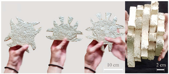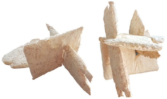 In the first experiment, five modules of different shapes were studied, testing the component geometry and conceptualization (Figure 3). The aim was to achieve a viable design solution of the unit’s geometry that allows the modules to be connected to form a modular system without the need for additional fixations. Each sample is designed within 100 cm2 and a density of 221 kg/m3, integrating one to four joints. Plastic molds were prefabricated and filled with the material, which was then left to grow for five days.