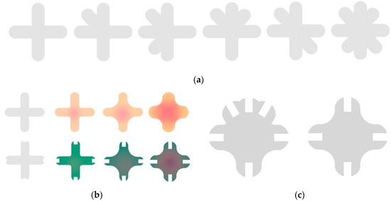 The design workflow was handled in the Rhino/Grasshopper computational design environment to facilitate the design process and obtain control over the chosen geometrical parameters. Geometrical variations of the cross-form size of 20 × 20 × 2 cm were generated and tested, with the highest number of joints, while the global geometric stability was maintained (Figure 5a). This is an important step for obtaining connection flexibility and generating complex compositions.