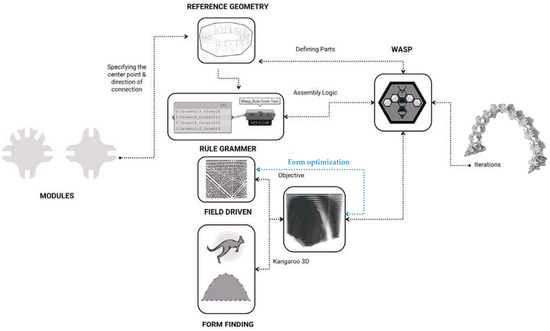 Computational design workflow overview: form-finding defining the assembly strategy of modular components and the optimization process for generating aggregation.
