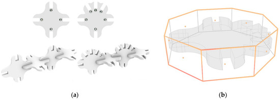 In architecture, various concepts of interlocking modular assemblies have been explored, where repetitive shapes are combined to form various configurations. The modular pieces have connection slots that allow them to join and lock together at different angles. The structural integrity of the interlocking system is achieved by distributing forces through the elements without the use of additional binding materials. Nguyen Khac Phuoc Architects and Dang + Partners created Module+, a permeable structure in rural Vietnam made up of 2000 cross-shaped modular wooden components. Each module has slots that allow the components to connect with one another [28]. This interlocking system relies on friction, without the need for additional fixtures, resulting in a self-supported system. Here, the configuration options are limited because the slots are located only along the components’ horizontal and vertical axes. A medium-scale demonstrator of Interlocking Particles was designed by Markus Hudert and exhibited at the 2017 Aalto Festival in Espoo, Finland [29]. It consists of six plywood panels that are connected on an orthogonal spatial pattern. This concept is based on a spatial arrangement of 145 × 145 cm modular panels with integrated slots. Each slot is one-fifth the length of the panel’s edge length deep. The structural performance of the global system was analyzed using finite element analysis (FEA). The resulting sculpture explores the fundamentals of interlocking modular assemblies in architectural contexts.