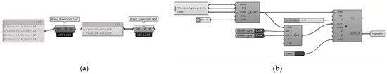 To design the assembly strategy for the elements, the Grasshopper plug-in Wasp was used inside the Rhino/Grasshopper environment [35]. The setup involves defining the rules and guidelines for connections by specifying which modules can interlock with each other via which slots (Figure 8a and Figure 9a). First, the center points of the interlocking slots need to be located. An octagonal prism of the modules’ boundaries was used as the reference geometry to simplify the geometric shape (Figure 8b). The center points of the slots’ faces were then located. Interlocking aggregation can be accomplished in several ways. The first method is to use a “rule generator,” which automatically generates all possible connection outcomes based on the defined center points of interlocking slots for random aggregation. A different method involves the use of a text string, which allows for the direct conversion of text into rules for generating controlled aggregation. Finally, all parameters are put into the aggregation setup, which is then executed to build aggregation (Figure 9b).