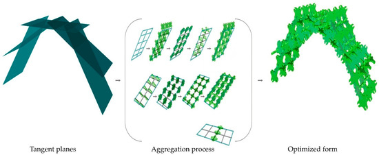 A numeric list was extracted, which included the points of the tangent planes, along with the geometry of the modules and their orientation. The list was then fed into the aggregation component to control the parts’ placement, following the workflow discussed in the previous section. The algorithm of the aggregation component could then generate the configurations while maintaining the planarity of the modules. The gaps and the discontinuity of the parts from each iteration were compensated by overlapping layers of modules over each other to create a continuous system. Furthermore, redundant elements were removed, ensuring that there were no loosely linked modules. The resulting final aggregation was a compact self-supported system.