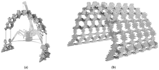 Seventy-three modules of 20 × 20 × 2 cm were joined in equilibrium along a catenary curve to form the final articulation of an arch structure: 2.4 m high, 3.7 m long, and 1 m wide (Figure 13a). This initial design showcases the potential of the developed system in a full-scale architectural application. Two support anchors, each made up of 28 modules, were designed to support the structure, acting as buttresses for transferring loads and ensuring overall stability. In two triangular arrangements, 14 modules were joined to form a cluster (Figure 13b). Two customized modules with a flat base were built for this layout to provide the foundation with extra strength. As a result of this configuration, loads could be transferred from one element to another, achieving equilibrium in the system. Similarly, large-scale applications can also be achieved by connecting multiple arches, using additional lateral horizontal modules as supports to form a vault (Figure 14).