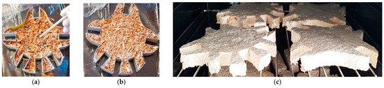 Production process: (a) Prefabricated molds filled with the growing material, (b) Incremental compacting for a higher density, (c) Grown samples ready to be dried in an oven.
