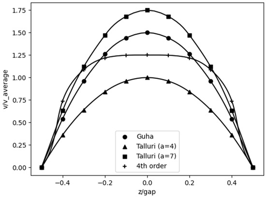 Improving on the previous approach, Talluri added a factor “a” in the parabolic profile. Factor “a” is not constant, as lower values indicate not fully developed flow and should be near the inlet, whereas higher values indicate fully developed flow and should be near the outlet. Integrating the Navier–Stokes equations between z = 0 and z = b/2 gives: