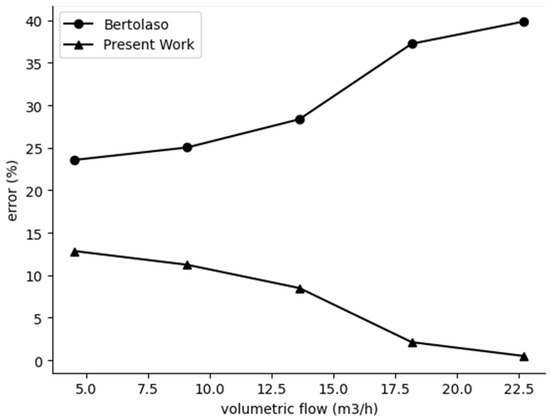 Error on the pump outlet static pressure of the present work and Bertolaso’s work against the flow rate for the case of 6000 rpm and internal diameter of 25.4 mm.