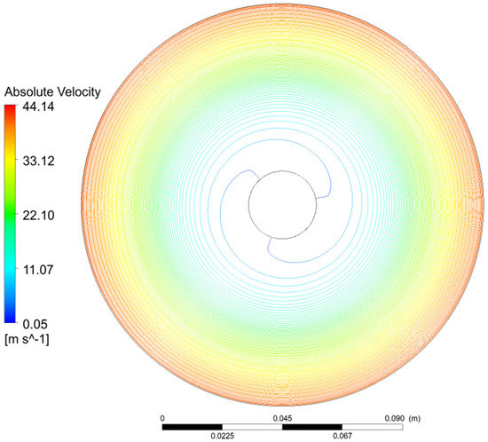 - Case B: the same geometry as Case A but with the gap set as 0.889 mm. This was done to identify if the inter-disk gap change has any significant impact on the flow field development, which would influence the rotor outlet–volute channel inlet flux features. The dimensions in the experimental study were originally in inches. The cases with gaps of 0.006 in. and 0.035 in. were converted into 0.152 mm and 0.889 mm, respectively; hence, the numbers are not round.