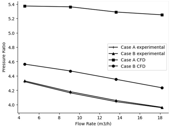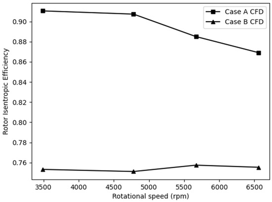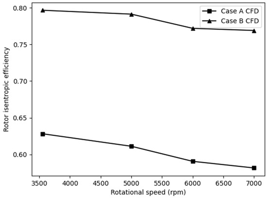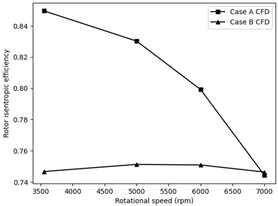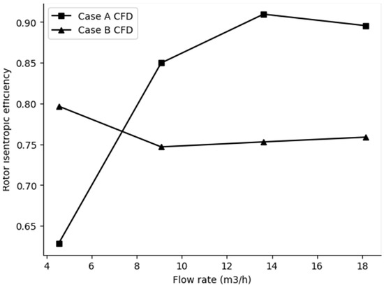 Comparison of the rotor isentropic efficiency of the two CFD Cases with a flow rate of 4.54 m3/h for various rotational speeds and a constant flow rate.