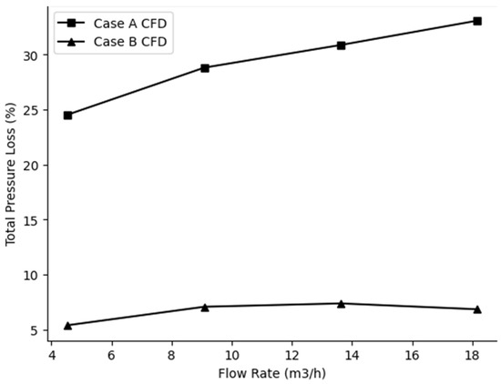 The comparison of the results for the Morris pump geometry with the updated version of the loss model with the baseline corrections for the volute model in Bertοlaso’s work is shown in Figure 3 indicatively for the case of a 6000 rpm rotational speed and a 25.4 mm internal diameter. The error in the pump outlet static pressure with the update in the volute loss model over the entire mass flow range has reduced from the range of 24–40% to 1–13%. Moreover, the updated physics-based model performs better near the design mass flow rates from 15 to 20 m3/h. The significant improvement obtained via the correct implementation of a volute loss model is a noteworthy improvement for the 1D design code. The opposite trend of the two curves in Figure 3 is attributed to the following major corrections on previous work: the number of the gaps is set as the number of the disks minus 1, the velocity in Equation (10) is raised to the second power, the coefficient in Equation (13) is set to 0.5, and the missing density factor is added to Equations (11) and (12).