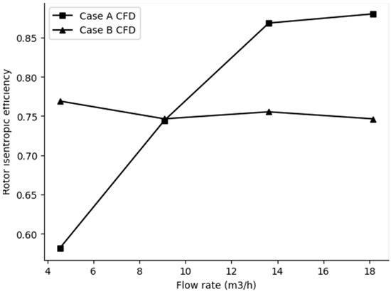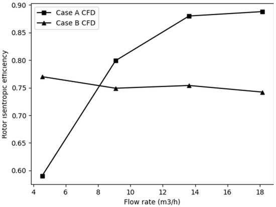 Comparison of the rotor isentropic efficiency of the two CFD Cases with a rotational speed of 6000 rpm and various flow rates.