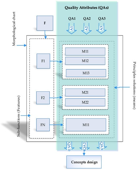 Product quality attributes (QAs) refer to incorporate features that have the capacity to meet consumer needs and gives customer satisfaction by altering products or services to make it free from deficiencies, this affects the success of the product and helps build its reputation in the customer markets. When the company creates high-quality products which fulfil its customers’ needs, this can reduce production costs, and improve return on investment []. When evaluating product quality, enterprises consider several key factors; whether the product can solve the problem and works effectively or satisfies the customers’ purposes and meets industrial standards. Therefore, QAs utilize to represent all product’s quality characteristics such as performance efficacy, materials, and adapted technologies to ensure that the required product quality specified in the early design stage, hence the product conceptual design morphological chart outcome will be high quality solution alternatives. QAs can be assumptions, constraints, or product stakeholders’ requirements such as performance, security, reliability which can be combined with functional requirements [,]. In software system design and implementation, four QAs, performance, dependability, security, and safety have used to make objective decisions on design trade-offs and enable designers to make reasonable and accurate predictions on system performance to realize a better overall system [].