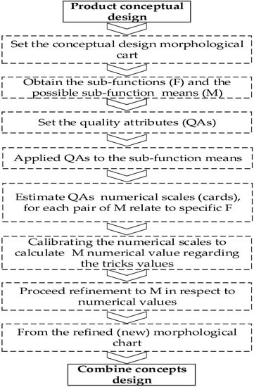 The transmission device conceptual design morphological chart above, contents nineteen sub-functions’ means; (M11, M12, M13), (M21, M22, M23, M24), (M31, M32), (M41, M42), (M51, M52), (M61, M62, M63), and (M71, M72, M73) corresponding to the features F1, F2, F3, F4, F5, F6, and F7 respectively, Table 2. According to Equation (1), these 19 means make the designers able to generate 864 concepts design. However, a big part of these combinations is not suitable for manufacturing and form final products. Therefore, sub-functions’ means must be reduced to save designers time, resources, and to introduce a few concepts design with high-quality attributes. Based on this purpose, the current technique is applied to realize the purpose of this product morphological chart refinement, and the application procedures with steps shown in Figure 2.