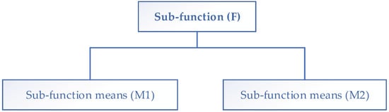 Design concept generation occur over two distinct stages: searching features to fulfil functional requirements, and generating concepts design by combining the features. Understanding existing solutions to similar problems and sub-problems make concept design generation smoother, as designer can find a new design solution or customize an existence solution. This means, customizing an existence solution with relevant components’ functions is helpful to find design solution faster and is most cost-effective than starting a new design. There are different design tools such as morphological chart support these two design stages []. Morphological chart is a design tool which aids designers to identify consistence design solutions schemes, besides providing significant help by making designers’ ideas more clear before design solution generation. Figure 1 illustrates morphological chart which encompasses possible sub-functions or features (F) and its relevant means that can be combined to form concepts design. Design solutions schemes are created from morphological chart are proportional to the sub-functions number after browsing the chart content, then the designer determines the most promising concepts design, thus in case the number of possible sub-solutions and means are big, the combined systems generated usually quite a lot as these systems include not only existing conventional means, but also various new means [,]. The number of concepts design combinations that can be created from the chart calculate regarding the sub-functions and proposed means by multiplying the number of means time sub-functions, Equation (1) [].