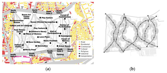 However, while research to apply such cutting-edge technologies to the urban and architectural fields is actively being conducted, research on methods that can be used for the design and management of open spaces is still in its infancy. The importance of external space in overcrowded cities has become more prominent after the outbreak of coronavirus disease 2019 (COVID-19). Additionally, the possibility that open spaces, including parks, can become a basis for adaptation and mitigation to climate change has been studied through various research efforts. This suggests that the field of landscape design and management also needs to respond quickly to the changes in technology [2]. Therefore, among the various types of external space, the park, which has the most prominent character as public urban infrastructure, should be planned and redeveloped as a smart park that actively reflects smart technology, rather than being designed and managed in a traditional way. The construction of the smart park can be categorized into the construction of a new park, and the improvement of an existing park. Currently, new smart parks of national pilot cities in Korea, such as Lake Park in Sejong City, and a landmark park in Eco Delta City, are about to be built. In the case of existing parks, upgrades are being planned in several places, starting with the National Debt Compensation Movement Memorial Park (NDCMM Park), to provide better services. Kim et al. observes that in the case of the NDCMM Park, the grafting of information and communication technology fails to express the essential value of an urban park in terms of aesthetics and usability [3]. In the case of newly created parks, the application of new technologies is relatively flexible, while the smartization of existing parks requires careful consideration of the given condition. The management and upgrading of existing parks play very important roles in improving the overall quality of the city from the fact that the area of existing parks is much larger than the area of new parks in a high-density city, such as Busan.
