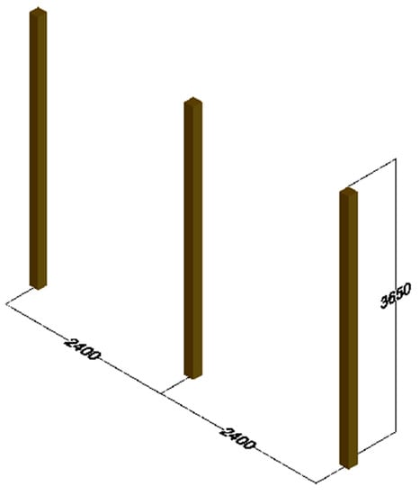 To begin, 6 × 6 × 16 posts must be sunk at least 1.2 m into the ground to prevent frost heaving of any soil type. This is carried out according to the National Building Code of Canada (NBCC) Table 9.12.2.2 [68]. Each post should then be standing 3.65 m above the ground. Each hole should be spaced at 2.4 m, as shown in Figure 1. Holes should be at least 250 mm in diameter. Two bags of 30 kg Quikrete ready-mix concrete can be mixed with water in a wheelbarrow to make footings. Once each hole is filled, the previously removed topsoil can be used to cap the hole. This should be carried out in order to ensure that water runs down the slope away from the footing.