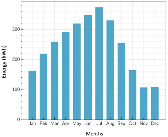 Figure 7 shows the monthly aggregated energy performance of the bifacial vertical tilt PV system during the first operation year. As expected, the system generates more energy during the summer than it does during the winter. The maximum monthly energy production is 373 kWh in July, and the minimum monthly energy production is in November, with 107 kWh. The annual energy generated during the first year is 2938 kWh and the 25-year lifetime energy is 68,940 kWh.
