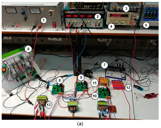 Experimental setup of the proposed system; (a) general overview of the prototype, 1—DC power source, 2—power source to supply control circuit, 3—signal generator, 4—multimeter, 5—oscilloscope, 6—PLC AXC1050 controller from Phoenix Contact, 7—microchip DSP microcontroller 30F4012, 8—first DC–DC converter, 9—second DC–DC converter, 10—third DC–DC converter; 11—voltage sensor PCB, 12—current sensor PCB, 13—inductors; (b) detail of the DC–DC power converter and inductor adopted.