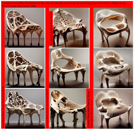 The authors have previously employed Rhinoceros 3d and Grasshopper + Kangaroo and other plugins to develop a complex biomathematical model combining a differential growth + reaction–diffusion + solidification model algorithm for simulating the chronological development in the morphology of the proposed bioactive self-biomineralized material while mineralizing from the gel state to the solidified state, as well as differential growth 3D patterns within the volume of a 5 cm Petri dish. However, the furniture or architectural design scale was a more advanced stage that the designers wanted to visualize using AI text-prompt-generated images. The diagram in Figure 1 exhibits a comparison of the biomaterials research-driven design process between complex biomathematical modeling conducted by the authors and the AI text-prompt-generated images in terms of the form-finding process and physical characteristic representation of the biomaterial as the main subject in this study. Figure 1 shows that AI-generated images have achieved high-resolution renders that can be considered as the form-finding step as well as the end step in the design process as renders that accurately express the diversity of the bone tissue hierarchical structural motifs in its spongey (cancellous) tissue, its dense (cortical) bone tissue, and its mineralized muscle bone tissue. Furthermore, the AI text-to-image model achieved complex results that include both cancellous and cortical bone or cortical and minimalized muscle tissue. The AI text-prompt-generated images have exhibited success in learning to synthesize from the text prompt (bone tissue + chair, brick, façade, or pavilion) combining the learned mathematical patterns and logics from the two distinct fields of anatomy/histology and furniture design, as exhibited in Figure 2. This proves the complex cognitive capacity of the model to understand and discover patterns in both datasets (chairs and bone) and synthesize them into new knowledge, as well as representing the material’s detailed histological scale through learning to identify osteocytes which are the bone decomposers and osteoblasts which are the bone builders only by using the word prompt “osteo cells”, as exhibited in Figure 1. On the other hand, the AI-generated images (Figure 1 and Figure 2) might relate to the design style of H. R. Giger of biomorphic surrealism and exaggeration as well as Gaudi and Calatrava’s design style when compared to the biolearning process that the authors conducted by employing complex biomathematical modeling to develop the chronological biomineralization simulation of the engineered material from the bioink gel phase to the biomineralized material phase. This biolearning process performed by the authors, especially in the research’s early stages, focused on the abstract structural morphology of the biomineralization process exhibited more as cancellous bone tissue and more in a regular pattern than a biomimicry pattern that exhibits the real heterogeneous distribution of mineralization in bone tissue, mainly to test the differential growth pattern effect on osteosarcoma cell viability, not to visualize the final design product as furniture, bricks, etc. Thus, the main objective focused on the material itself and its morphological development via biomineralization. However, in the current phase, in which the research is focused on achieving biomimetic 3D models of hierarchical bone structural motifs informed by advanced microscopy, the AI-generated images seem to be closer to achieving a creative result of visualizing full design product models that are informed by the rich literature of bone tissue microscopical studies and reconstruction 3D modeling AI tools as well. While the biolearning design process developed by the authors is still in its infancy, it is starting to employ advanced microscopy techniques such as µCT and FIB-SEM to detect multi-scale hierarchical bone structural motifs from nano to macro.