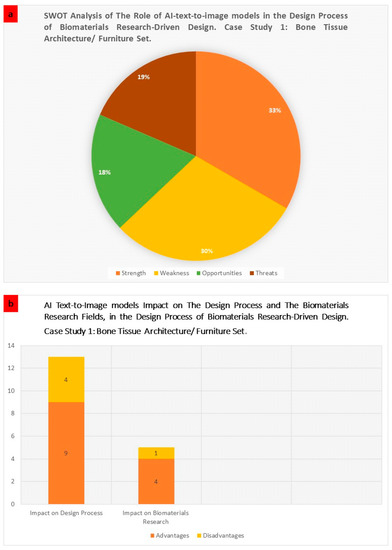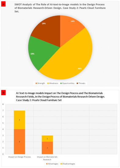 From Figure 3a, it can be concluded that in the integration of AI text-to-image models in this specific case of biomaterials research-driven design case study 1, the integration of AI text-to-image models has achieved approximately balanced performance where its strengths (33%) are slightly outweighing its weaknesses (30%). Similarly, it has achieved nearly equal opportunities and threats in this case study. However, when it comes to the quantitative–qualitative analysis of the impact of the integration of AI text-to-image models on each discipline separately as exhibited in Figure 3b, it achieved a higher positive impact on each discipline (design and biomaterials research). Its advantages outweigh its disadvantages in the design process by a 2.25:1 ratio. As for its impact on the biomaterials research field, its advantages outweigh its disadvantages by a 4:1 ratio. This proves that AI text-to-image models were very useful in the integration of this case study.