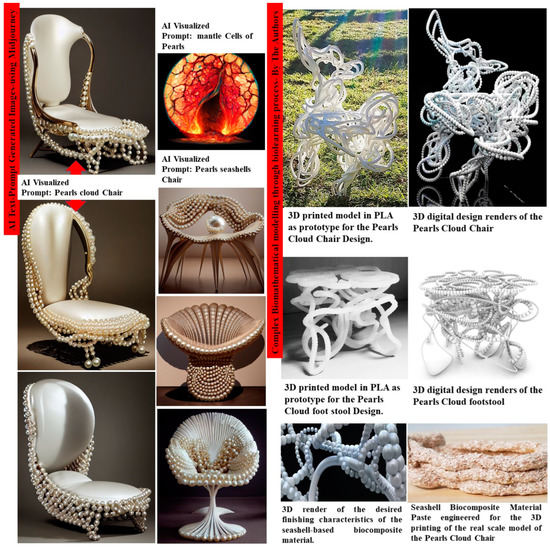 The pearl cloud chair form was generated following a form-finding process employing a biomathematical model abstracting the physical–chemical reaction of the natural pearl formation inside the oyster. The process begins with a foreign substance gliding into the oyster between the mantle and the shell, which irritates the mantle, as the mantle is responsible for producing the oyster’s shell, creating nacre that lines the inside of the shell. The oyster’s natural reaction is to cover that irritant with layers of the same nacre substance to protect itself, eventually forming a pearl [57]. This reaction was biomathematically modeled through a reaction–diffusion algorithm in the 3D space abstracting the diffusion of the chemical reaction causing the covering up of the foreign body with nacre layers inside the oyster’s shell 3D space. This created positive and negative attractor domains resulting from the diffusion domains (distribution) of the nacre chemical substance. Later, the positive domains were translated into polylines that resulted in the intricately interwoven lattice form of the Barcelona pearl cloud chair set. This case study is different from the previous one since the objective is not biomimetic forms but more complex biomathematical biobehavioral forms. However, the current case study employed form-finding methodology in comparing the human-generated design and the AI text-to-image generated renders as well, since form making would imply using the image modification method as an image-to-image model, which is not the case in the current research. Furthermore, comparing the creative cognitive capacities between a human design and an AI image generator can only be accomplished by comparing their form-finding results using the same keywords of the design concept (text prompt) to prove that AI cannot replace the human designer. In the current case study, AI produced high-resolution photorealistic renders of the iridescent nacre of the pearls in various ways. However, it failed to capture the histological details of the pearls’ material composition, as exhibited in Figure 4. The used prompt “mantle cells of pearl” did not represent the microscopic-level details of pearls sufficiently (like the SEM images exhibited in [58]. Furthermore, the AI-generated images using the prompts “pearl cloud chair” and “pearl seashell chair” failed to achieve relevance to the key formal features of the biomathematical biobehavioral model that was developed by the authors. There is a probability of 10–30% relevance only considering that the pearl cloud furniture design idea is based on the assembly of multiple pearls together to form continuous lattices, paths, or surfaces (Figure 4).