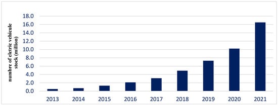 Since its appearance, the automobile has become more and more a main necessity for human beings, which allows them to make life easier and minimize travel time. However, in recent years the automobile sector has posed certain problems, such as gas emissions, the greenhouse effect, dependence on oil, which continues to become scarce, etc. These circumstances impose an orientation towards new technologies to overcome these problems [1]. In the upcoming years, electric vehicles (EVs) powered by renewable energies, can play a significant role in the transition to sustainable modes of transportation, reduce CO2 emissions, and improve local air quality. Currently, the rate of EV development is exponentially increasing, more than 16.5 million electric automobiles were in circulation in 2021, a tripling in only three years as shown in Figure 1 [2]. The main forces behind the recent global growth of EVs are the tightening of CO2 emission limits that took place in 2020 and 2021, as well as the increase in the price of fuel. The pace of sales was also aided by the increase in tax breaks and the increase in purchase subsidies [2].