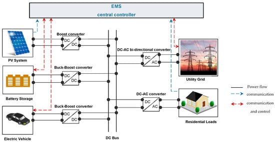 The general structure of the overall control system of the proposed residential system is presented in Figure 3. The control system detects the power produced by the PV, the power demanded by the residential loads, the availability of EV, the state of charge and the charging power of the storage battery and the EV, the voltage from the DC bus to generate the control signals for each power converter, in order to control how much energy is exchanged in the residential system between the loads and the sources.