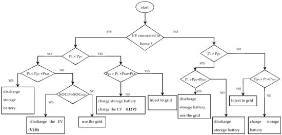 The proposed rule-based algorithm makes it possible to plan the use of the components of the residential system according to the power produced, the power requested and the availability of EV. The electric vehicle has two operating cases. The first case when the EV is connected to the home, in this case the electric vehicle participates in the residential system and can operate in two modes. The H2V mode, in this mode the vehicle is considered as a load, it consumes energy. The V2H mode, in this mode the vehicle is considered as an energy source, it provides energy. The second case of operation is when the EV is not connected at home, in this case the electric vehicle does not participate in the residential system.