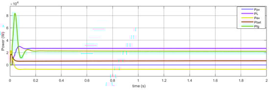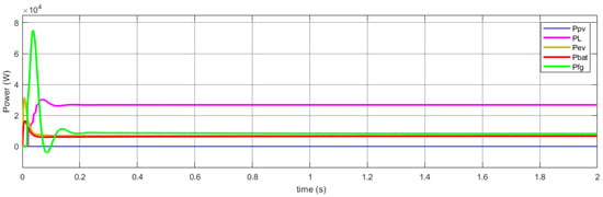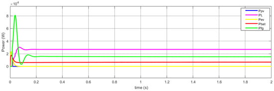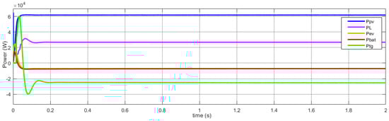 As shown by Figure 12, the PV power and the storage battery power are not enough to supply the residential loads, and the EV is discharged. In this case, the grid intervenes to ensure the load requirements are satisfied, and the EV operates in the H2V mode.