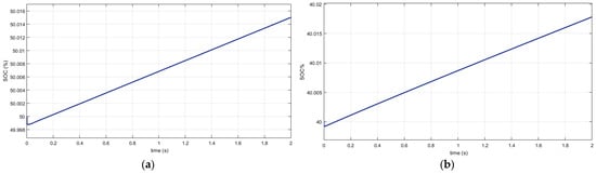 Figure 13 represents the SOC of the EV and the storage battery. The EV operates in H2V mode, it charges through power from storage battery, PV system, and utility grid.