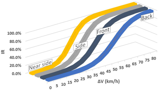 The model in Figure 2 based on the injury indicator Maximum Abbreviated Injury Scale equal or greater than 3 (MAIS 3+) is used to assess the risk of injury to vehicle occupants, where it is a function of the area of intrusion and the velocity change sustained by the single vehicle during the impact . In this modelling, the most severe types of impact for the occupants at equal are those where the area of intrusion is in correspondence of the compartment on the same side of an occupant seating position (“near side” impact); in descending order of severity, impacts to all other side areas (“side” impact), front (“front” impact), and rear regions (“back” impact) are sequentially found. The ADAS intervention can modify both and impact type at the same time. In this study, it is assumed that there are occupants in the vehicle positioned on both the right and left side of the vehicle, so that impacts on the compartment are always classified as “near side” impacts.