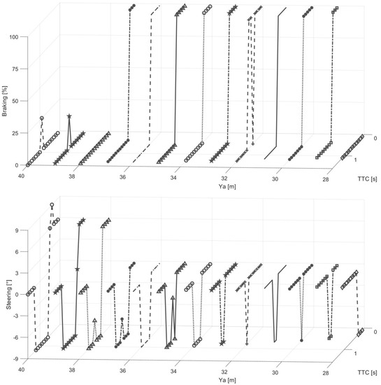 Figure 4 summarises the braking and steering interventions by the adaptive logic when varies, as a function of the TTC and for = 4 m. The system always tries to steer to the right (negative steering angles) and rarely to brake, except in the last moments before the collision (low TTCs); the possibility of insisting on the steering degree allows extremely eccentric crash conditions with a reduced to be reached, despite the fact that remains almost identical to the relative speed between vehicles at the beginning of the criticality if no braking is applied. The priority for the system is therefore to steer for piloting the ego vehicle towards eccentric impact conditions and only then to decrease the speed of the ego vehicle to reduce ; this is also in line with the typical reaction of a driver in correspondence of this type of scenarios, according to [29].