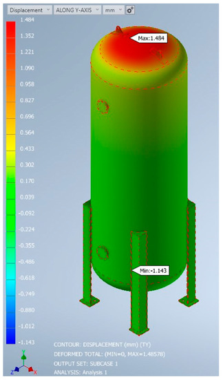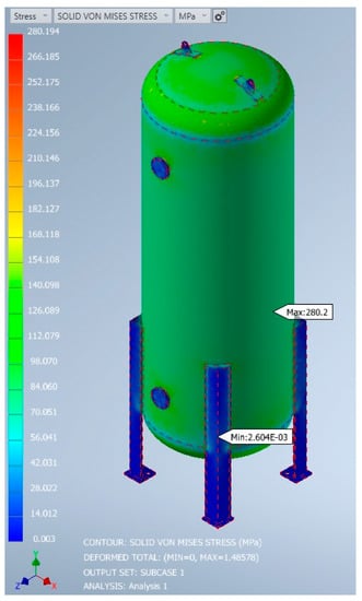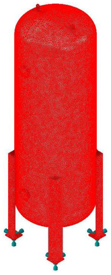 In addition to the analysis, certain additional parameters have been considered. Fixed constraints have been placed on the base of each leg, considering the downward gravitational acceleration of 9.8066 m/s2. The internal faces of the vessel have been subjected to a fixed pressure, equivalent to the design pressure of 1.705 MPa.