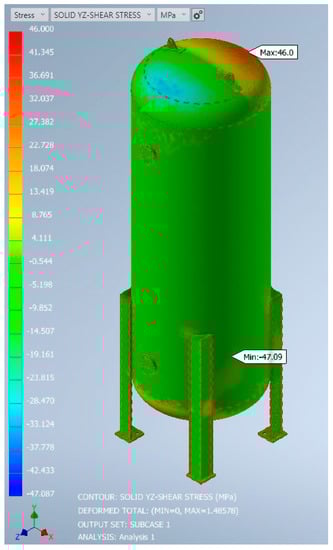 The resulting stresses were found to be significantly lower than the ultimate strength of the material, which was 485 MPa. However, the highest stresses exceeded the design stress, showing that some adjustments may be necessary to ensure the safe operation of the pressure vessel.