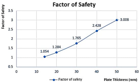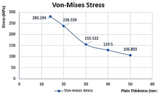 Table 12 shows a summary of von Mises’s factor of safety and displacement FEA values extracted for different plate thicknesses. These FEA values have also been represented graphically, with von Mises stress (stress developed) versus thickness shown in