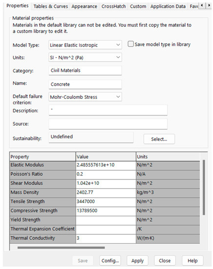 Once the concrete portions of each wall had been modeled, the material properties were assigned to each model to accurately represent the behavior of a concrete wall. For this purpose, the properties of concrete were researched, and then these properties were assigned to a new material created in SolidWorks. First, a compressive strength of 27,579,000 Pa (4000 psi) for the concrete was found in the software database [14]. It should be noted that this value is towards the upper limit of the range defined by the companies in the industry for the compressive strength of their printed materials (between 2000 psi to 3500 psi) [15]. Then, the elastic modulus was found, according to Section 19.2.2 of the ACI 318 Code (http://aghababaie.usc.ac.ir/files/1506505203365.pdf and https://mattia.ir/wp-content/uploads/2020/10/ACI-318R-19.pdf; accessed on 28 December 2022), using the equation 57,000 × (compressive strength in psi)1/2, which yielded a value of approximately 25,000,000,000 Pa (about 3,600,000 psi) [16]. Additionally, Poisson’s ratio was taken to be 0.2 [14]. Then, the shear modulus was found using the equation elastic modulus/(2 × (1 + Poisson’s ratio)), which yielded a value of 10,420,000,000 Pa (1,511,293 psi). Additionally, the density and the tensile strength were found to be 2402.77 kg/m3 (150 lb/ft3) and 3,447,000 Pa (500 psi), respectively [14]. Finally, the thermal conductivity and the specific heat were found to be 3 W/m·K (1.734 BTU/h·ft·°F) [17] and 750 J/kg·K (0.179 BTU/lb·°F), respectively [14]. As for the failure criterion, Mohr–Coulomb stress was used, since this is more accurate for brittle materials (such as concrete) [18]. All of these values were assigned to a material that we defined and called “concrete” in the SolidWorks software (which can be found in Figure 1), and we then assigned the properties of this “concrete” to the concrete that was previously defined and modeled (as discussed above). In this study, concrete was defined as a linear elastic material. Though, in tension, this is true until failure, in compression, concrete is linear and elastic up to the point where it nonlinearly reaches its ultimate compressive strength [19]. It was noted that the stress–strain curve of concrete is linear elastic up to approximately half of its compressive strength [20]. Therefore, for this study, the linear-elastic portion of concrete’s stress–strain curve was used to evaluate the stiffness of different walls while still uncracked. Thus, the compressive strength was taken to be 2000 psi, and the tensile strength was taken to be 500 psi, which were considered as the failure points for this study. This showed the stiffness of uncracked sections and displayed the weak points in each wall, as well as the overall behavior of each wall before cracking occurred.