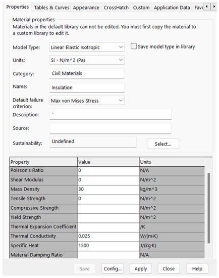 Next, the properties of the insulation material (rigid polyurethane foam) were determined. Since insulation was not used for the structural study, only the density and the thermal properties of the insulation were defined. The density, thermal conductivity, and specific heat were defined based on the literature [31], being 30 kg/m3, 0.025 W/m·K, and 1500 J/kg·K, respectively. These properties were then assigned to an insulation material that we created and gave the name “insulation” in SolidWorks, which can be seen in Figure 8.
