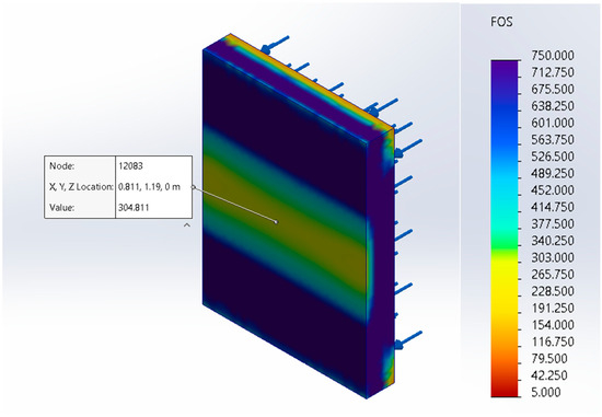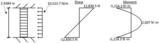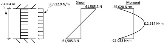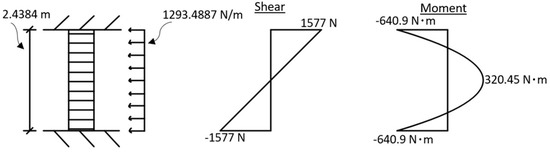 As an example, the behavior of a solid concrete wall with the same conditions as those used for the other walls in this study was modeled in SolidWorks. More specifically, the top and bottom faces of the wall were taken to be fixed, and a pressure of 717.25 Pa was applied to the wall. Then, the result of this study was compared to a hand calculation of the factor of safety value (using the Mohr–Coulomb failure criterion) of this same wall. The SolidWorks result can be seen in Figure 9. In this figure, the central portion of the back face of the wall is in tension, which can be seen with yellow shading. Upon closer examination, the factor of safety value for this portion of the wall was 304.8. The loading conditions and shear and moment diagrams for this wall can be seen in Figure 10. To complete the hand calculation, the top and bottom faces of the wall were fixed (as they were in SolidWorks). Then, equilibrium conditions were applied to determine the respective moment and force values of the wall. Following this, the shear and moment diagrams were drawn. The principal stress at the center of the wall was then calculated using the flexural formula. This principal stress value was then divided by the tensile limit (as performed in SolidWorks) to determine the factor of safety value for the central portion of the back face of the wall. The value for this portion of the wall resulted in a factor of safety of 300. Thus, the two values are comparable.