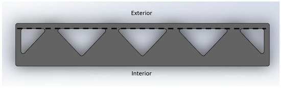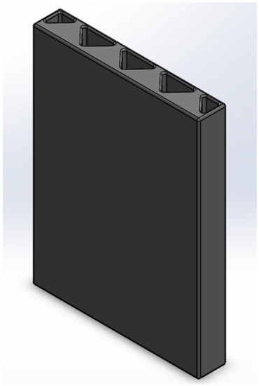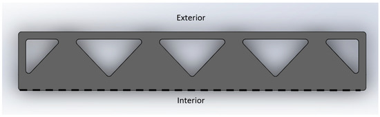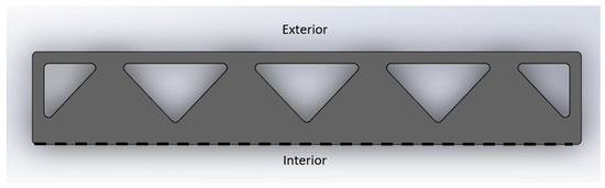 Finally, a total of five different wall configurations were analyzed in this study. The overall shape of each wall was based on the shapes found in the industry through the research conducted (especially from [22,25,26,27,28,29,30]). In all, the five walls consisted of a symmetric two-cavity wall (as seen in Figure 3), an internal small-arched two-cavity wall (as seen in Figure 4), a zigzag cavity wall (as seen in Figure 5), a trapezoidal cavity wall (as seen in Figure 6), and an internal large-arched multicavity wall (as seen in Figure 7).