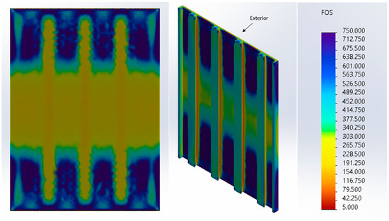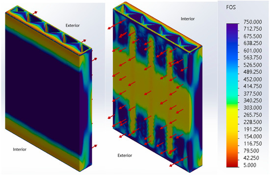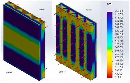 The structural results of each wall show several revealing trends that should be noted. The walls used in this study and their results can be found in Figure 3, Figure 4, Figure 5, Figure 6 and Figure 7. First, the concrete connecting the exterior and interior faces of these walls allowed for the entire thickness of the wall to act in resisting the stress applied to the wall. It is seen that in the first two walls studied (the symmetric two-cavity wall and the internal small-arched two-cavity wall), there is no concrete webbing on the interior and exterior faces of the walls. As a result, the thinner exterior concrete layer was responsible for resisting the majority of the applied load. This was not the case for the last three walls that were studied (zigzag cavity wall, trapezoidal cavity wall, and internal large-arched multicavity wall). In these walls, there was significant webbing present to connect the interior and exterior faces of the wall. As a result, pressure could be transferred from the exterior face (where the pressure was applied) to the interior face of the wall, thus showing that the entire thickness of the wall was utilized to resist the applied pressure. The factor of safety values for each wall studied (when pressure was applied to the interior of the wall) can be seen in Figure 33, Figure 34 and Figure 35.