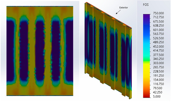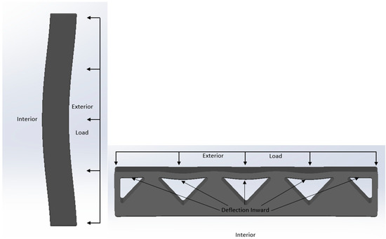 The first set of information gathered was related to the isometric factor of safety plot of the entire wall. As seen in Figure 16, the wall possesses several locations that have lower factor of safety values. More specifically, the isometric view on the left of Figure 16 shows that the wall acts in a manner similar to a vertically oriented fixed–fixed wall. In more detail, since there is significant webbing connecting the interior and exterior faces of the wall, the wall appears to behave more like a solid fixed–fixed wall, that is, a wall fixed on the top and bottom. More specifically, if a pressure is applied to its face (as for this wall), and it is fixed at its top and bottom faces, then tension will be present next to its supports and in the middle of its back face. In the case of this wall, there are lower factor of safety values for the center of the interior face of the wall. The wall also has low factor of safety values at the top and bottom of its exterior face. As previously discussed, these lower factor of safety values indicate that these portions of the wall are in tension, since the tensile limit of concrete is much lower than the compressive limit of concrete. For a better understanding, Figure 17 displays two images of the deflected shape of this wall from the perspectives of the side and midplane.