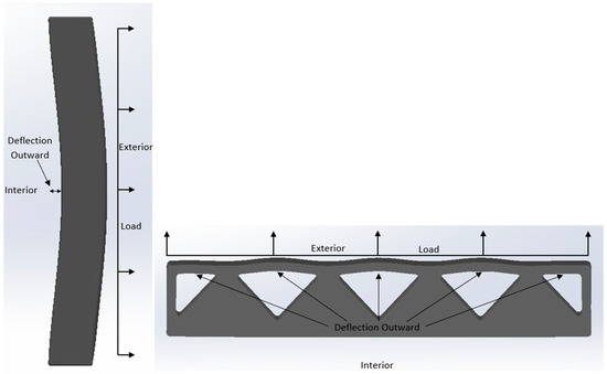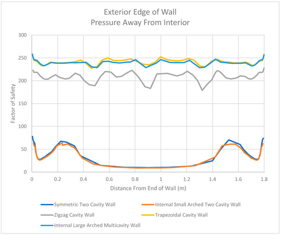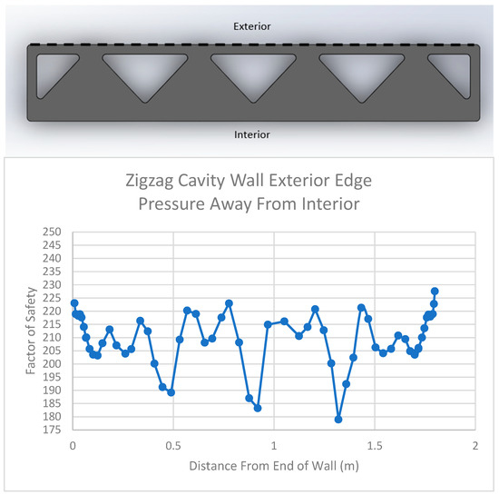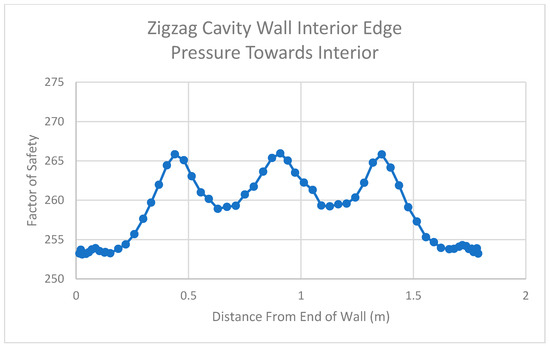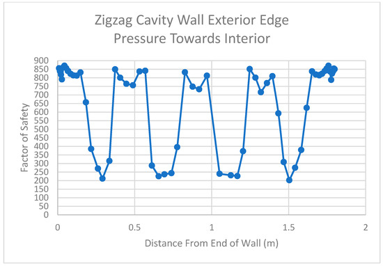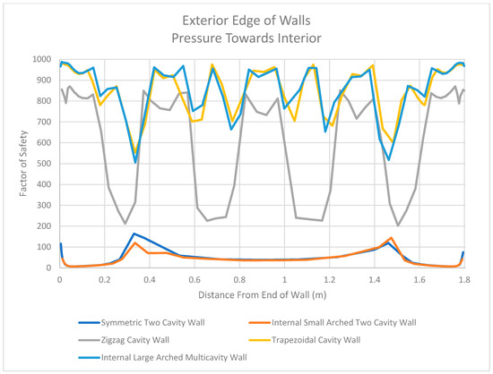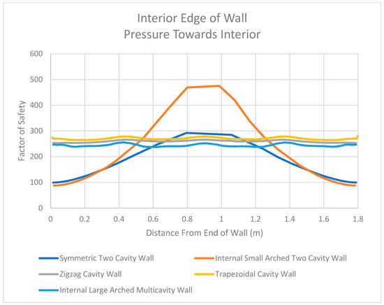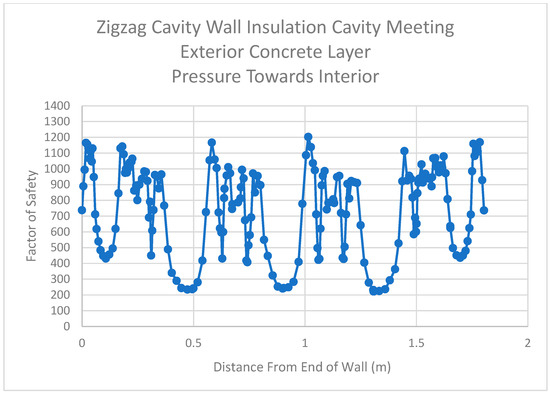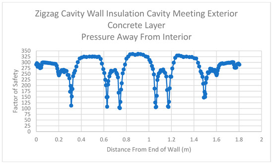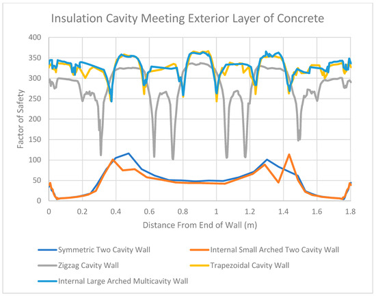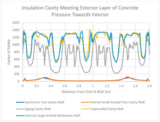Additionally, it was seen that the first two walls studied (the symmetric two-cavity wall and the internal small-arched two-cavity wall) had much lower factor of safety values where the insulation cavity came into contact with the exterior concrete layer. When pressure was applied to the interior of the wall, the middle portion of this exterior concrete layer had factor of safety values as low as approximately 10 for these two walls, which can be seen in the graph in Figure 34. The remaining three walls that were studied (zigzag cavity wall, trapezoidal cavity wall, and internal large-arched multicavity wall) had higher factor of safety values at these locations. More specifically, the lowest factor of safety value occurred at the center of the unsupported length of each wall’s exterior concrete layer (when pressure was applied to the interior). The factor of safety value reached as low as 200 for the zigzag cavity wall at this location, which can also be seen in Figure 34. Though much larger in value than 10, this factor of safety value of 200 is logical. It was mentioned that the unsupported lengths of these walls acted in a manner analogous to a fixed–fixed wall. When calculating the stress for a fixed–fixed wall that is transversely loaded (as is the case in this study), the flexural formula can be utilized (σ = M × y/I).