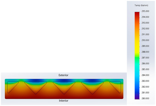Once the wall assembly was modeled, the insulation and concrete portions of the wall were connected as a bonded connection in SolidWorks. To represent a wall exposed to cold outdoor temperatures, a convection thermal load was applied to the exterior of the wall. This convection thermal load was given a heat transfer coefficient of 5 W/m2·K with a bulk ambient temperature of 273.15 K [33]. Additionally, a 295 K temperature was assigned to the interior side of the wall. The wall was then meshed in SolidWorks. Again, it was ensured that 90% or more of the elements in the mesh had an aspect ratio of less than 3. Subsequently, the results were gathered.
