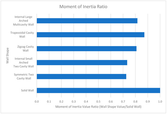 Figure 32 shows the moment of inertia values relative to the moment of inertia value of a solid wall with the same dimensions. From this figure, it is clear which walls produce the largest moment of inertia values. The symmetric two-cavity wall and the internal small-arched two-cavity wall produced relatively low moment of inertia values. On the other hand, the zigzag cavity wall, the trapezoidal cavity wall, and the internal large-arched multicavity wall all produced higher moment of inertia values. From this finding and the flexural formula (σ = My/I), it is clear that the amount of stress generated in these walls is inversely proportional to the moment of inertia of the wall. This means that the larger the moment of inertia is, the less stress is generated in the wall. Accordingly, it is clear that a larger moment of inertia value is beneficial for reducing the amount of stress present within the wall’s cross section. Additionally, the walls that contain webbing connecting the interior and exterior faces of the wall (the zigzag cavity wall, the trapezoidal cavity wall, and the internal large-arched multicavity wall) are seen to possess relatively larger moment of inertia values. Thus, it can be inferred that these walls generate less stress (due to an applied moment) as a result. Consequently, the walls with webbing (that have higher moment of inertia values) possess more stiffness relative to the walls without webbing.