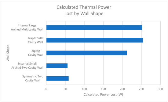 However, this was not the case when comparing the walls in the thermal study. As seen in the temperature distribution plots for each wall, the walls that contain webbing between the interior and exterior face of the wall contain more thermal bridging locations than those without webbing. For example, the first two walls studied (the symmetric two-cavity wall and internal small-arched two-cavity wall) had only two thermal bridging locations. On the other hand, the last three walls studied (the zigzag cavity wall, trapezoidal cavity wall, and internal large-arched multicavity wall) had several thermal bridging locations. This behavior was quantified using the net power function in SolidWorks. This function provides the ability to quantify the amount of heat lost to the exterior surface of each wall. From these calculations, it was clear that the walls without webbing (the symmetric two-cavity wall and internal small-arched two-cavity wall) lost between 55 W and 60 W. On the other hand, the walls with webbing lost over 200 W. Figure 39 displays the lost power that was calculated for each wall throughout the study.