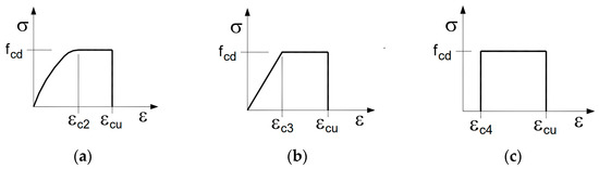 NTC 2018 [18] concrete constitutive laws: rectangular–parabolic (a), triangular–parabolic (b) and (c) rectangular “stress-block”.