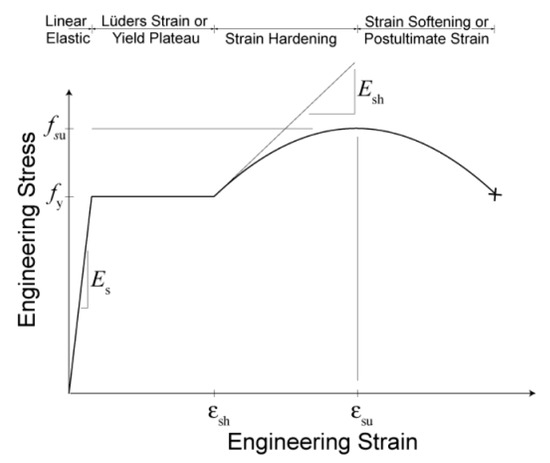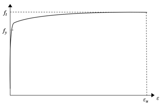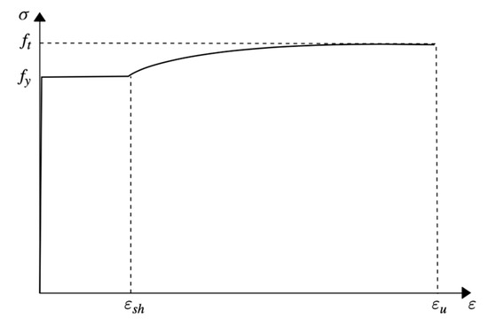Steel constitutive law is simplified with bilinear segments, depicting two features of steel: the yielding point (fy-εy) and the rupture point (ft-εu). In the case of steel, the hardening ratio is defined as an index of the hardening capacity, which varies from 1.05 to 1.35, depending on the type of steel [7].