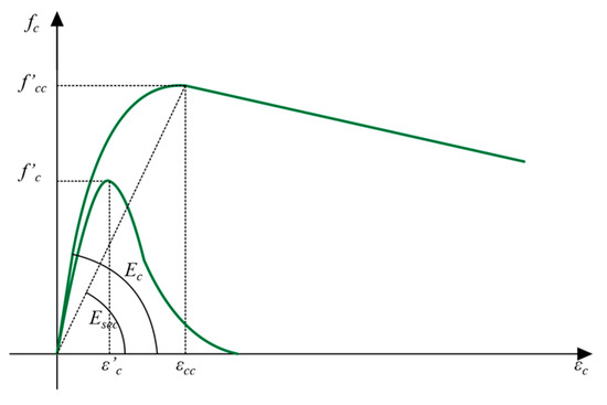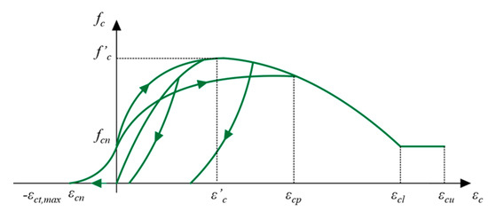 Mander et al. (1988) [22] proposed a constitutive bond for rectangular and circular sections subjected to monotonically and cyclically applied loads; this model is shown in Figure 7.