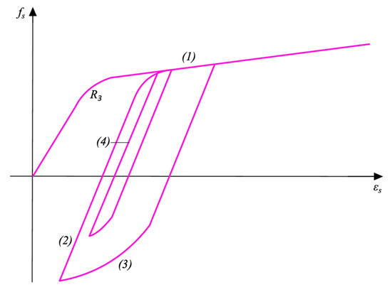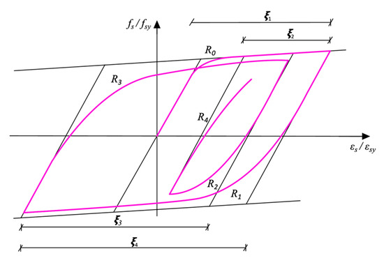 The first non-linear steel model was the Menegotto and Pinto model (1973) [23] (Figure 8). This model is based on the Giuffrè and Pinto law (1970) [24] which is a result of studies carried out by Capecchi et al. (1980) [25], Ciampi et al. (1982) [26] and Filippou et al. (1983) [27]. The constitutive law of steel shown in Figure 8 is defined by dimensionless parameters, and their relationships are described in [23].